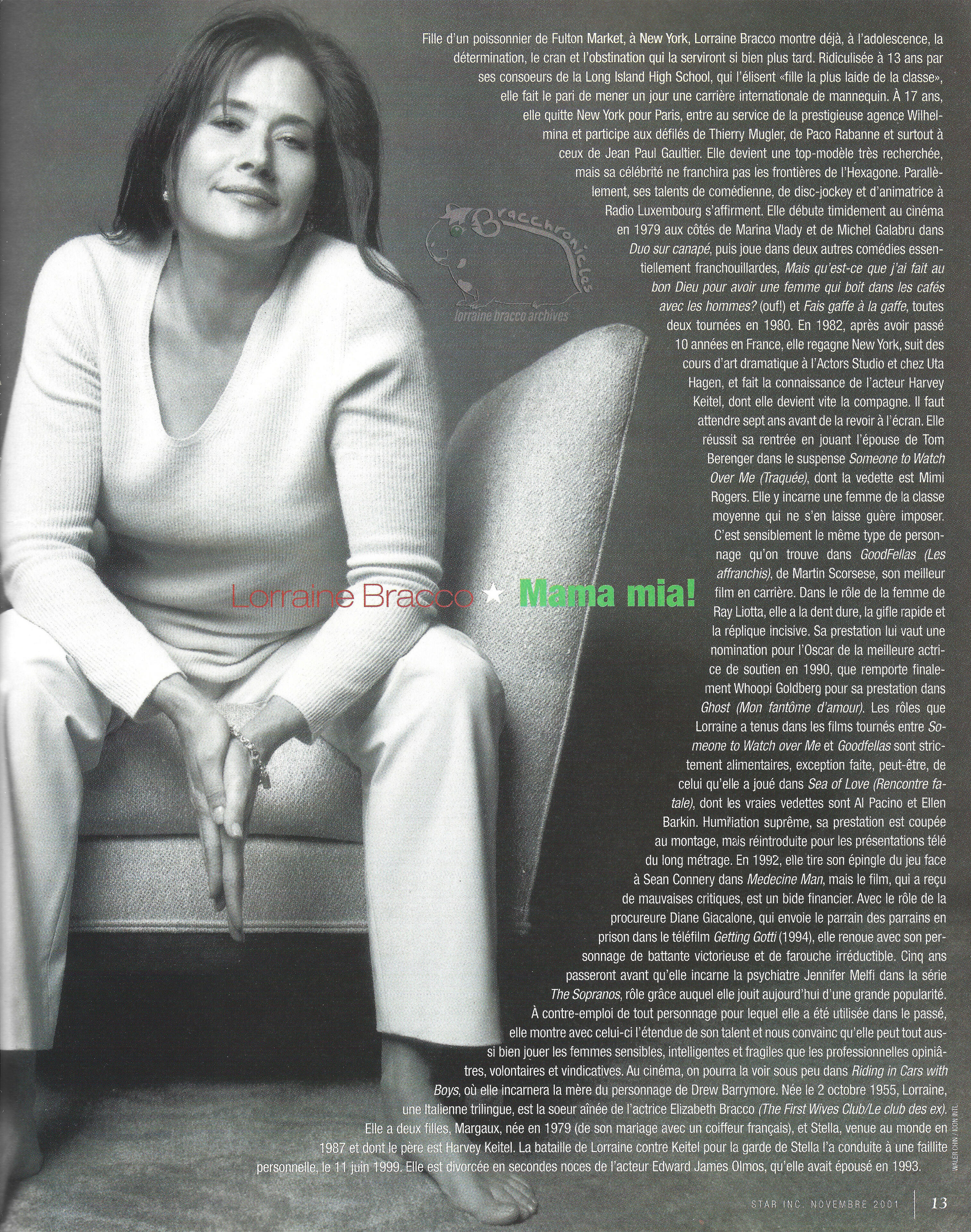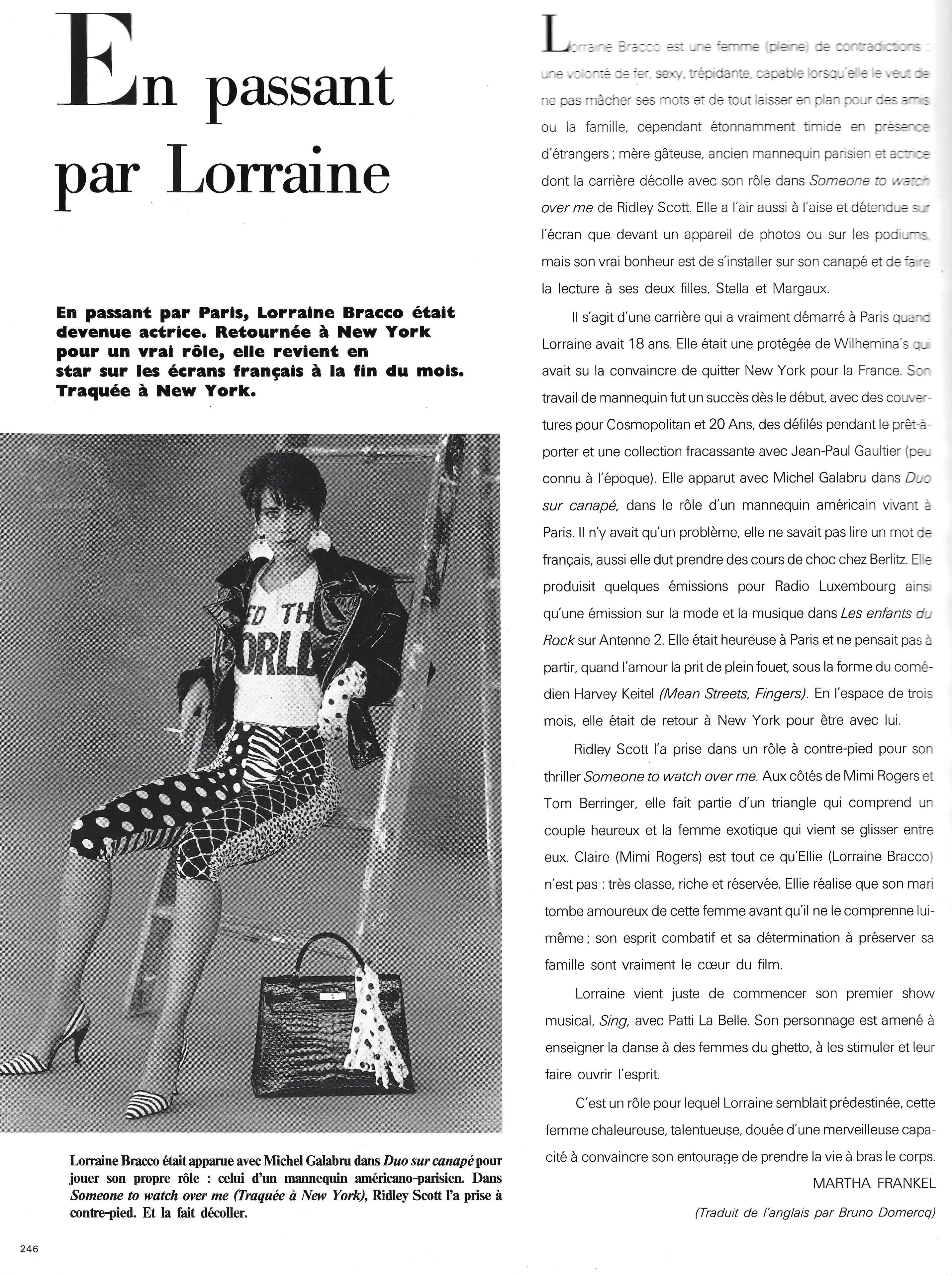 Passing through Paris, Lorraine Bracco became an actress. Returning to New York for a real role, she's back on French screens as a star at the end of the month in Someone to Watch Over MeLorraine Bracco appeared with Michel Galabru in Duo sur canapé playing herself, an American-Parisian model. In Someone to Watch Over Me, Ridley Scott took her by surprise. And launched her career.Lorraine Bracco is a woman (full) of contradictions: an iron will, sexy, vibrant, capable when she wants to speak her mind and will drop everything for friends or family, yet surprisingly shy in the presence of strangers; a doting mother, a former Parisian model, and an actress whose career took off with her role in Ridley Scott's Someone to Watch Over Me. She looks as comfortable and relaxed on screen as she does in front of a camera or on the catwalk, but her true happiness is settling down on her sofa and reading to her two daughters, Stella and Margaux.This is a career that truly began in Paris when Lorraine was 18. She was a protégée of Wilhelmina's, who had convinced her to leave New York for France. Her modeling career was a success from the start, with covers for Cosmopolitan and 20 Ans, runway appearances during ready-to-wear shows, and a groundbreaking collection with Jean-Paul Gaultier (little known at the time). She appeared alongside Michel Galabru in Duo sur canapé, playing an American model living in Paris.