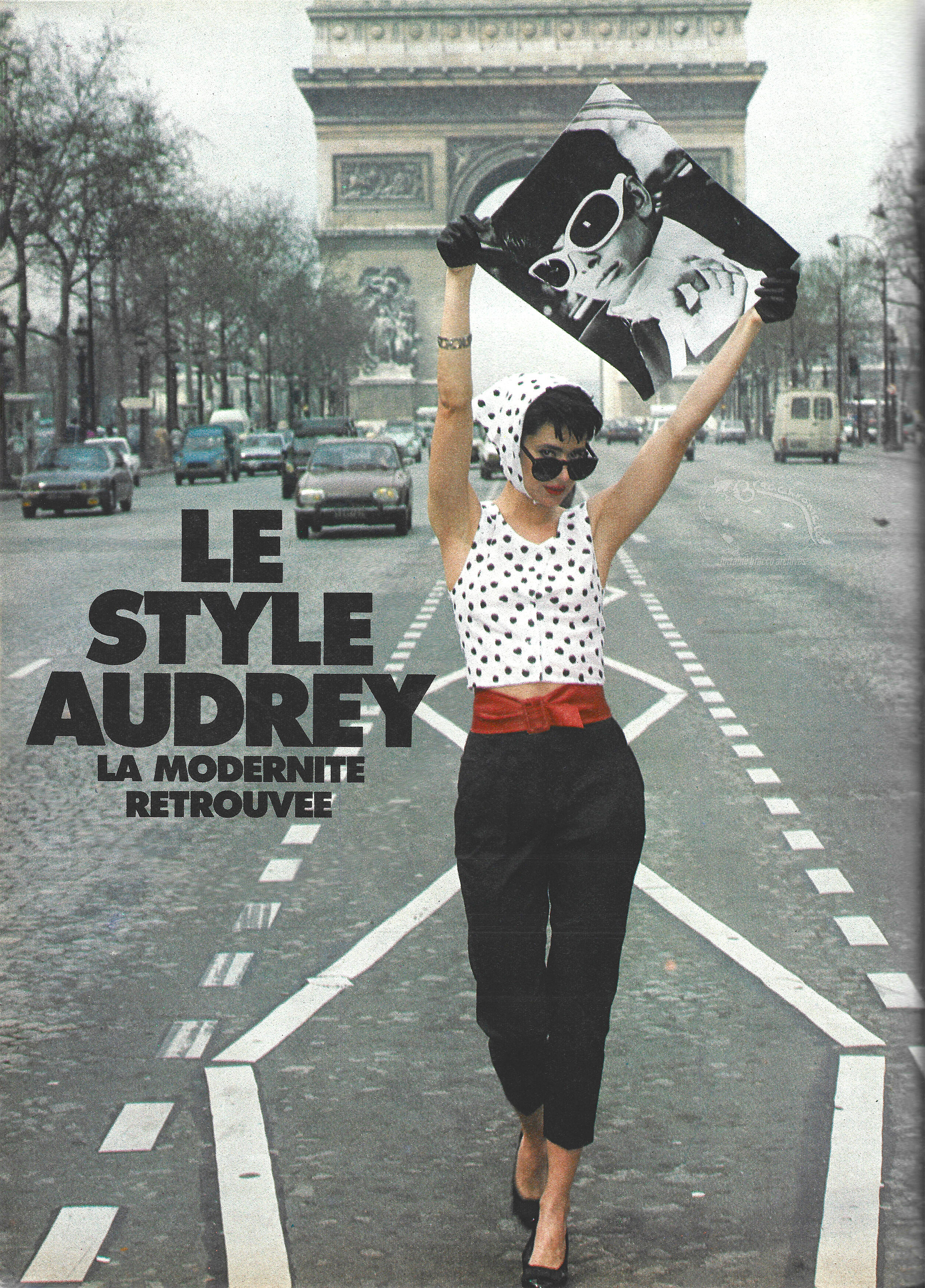 AUDREY'S STYLE: MODERNITY REDISCOVERED"Slender, flat chest, narrow hips, swan neck and very short hair, more brunette or redhead than blonde, full lips, smouldering eyes and pale makeup." This is how Paramount described the woman during the press release of Sabrina in 1955.Audrey Hepburn imposed a new style in contrast to the voluptuous Hollywood actresses of the time.Polka dot cotton camisole (1), buttoned at the front, with matching scarf. Cotton capri pants (Roby Sasson for ViaBo, 160 F for the camisole, 235 F for the capri pants). Bow belt (Scooter). Sunglasses (Lafont). Bracelet (ViaBo). Gloves (Yohji Yamamoto).Ribbed cotton dress (4), low-cut back (Scooter, 250 F). Earrings (Fried). Straw hat (Givenchy). Sunglasses (Lafont). Gloves (Yohji Yamamoto).
